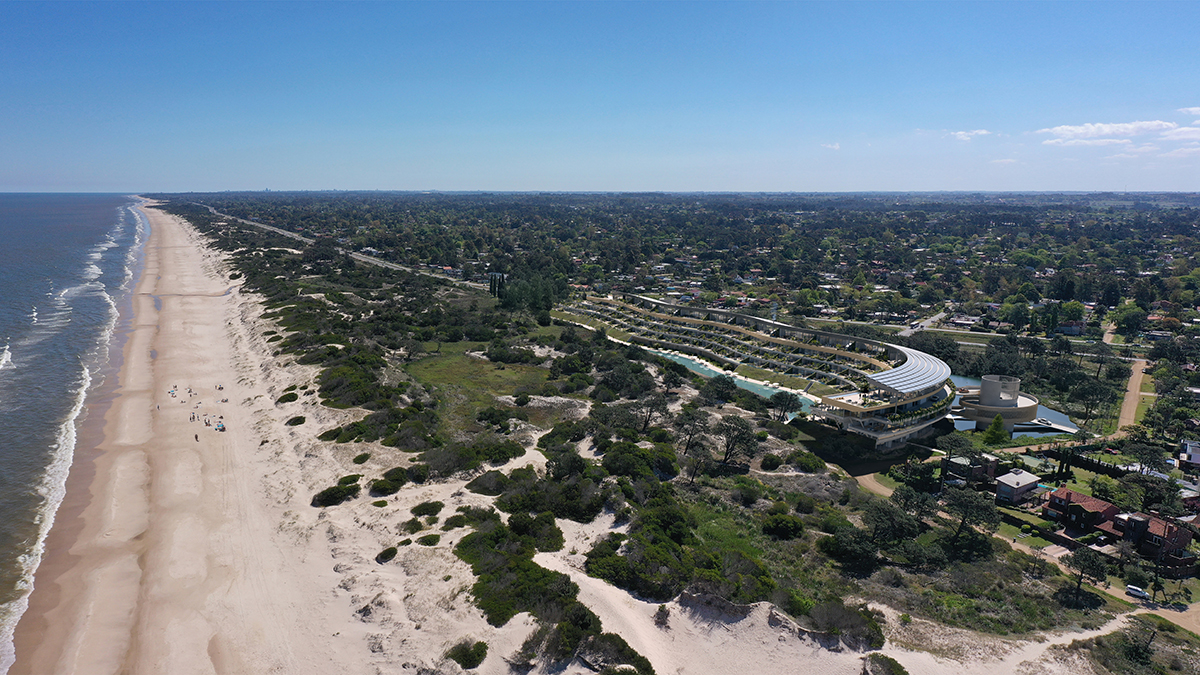Located 15 minutes from Montevideo, Uruguay, Médano by Viñoly is an ultra-sustainable beachfront residential development designed by Rafael Viñoly Architects. Positioned behind coastal dunes, its elongated, sinuous form follows the natural topography, preserving the character of the coastline while minimizing its visual presence and framing views of the Atlantic Ocean and a northern lagoon.